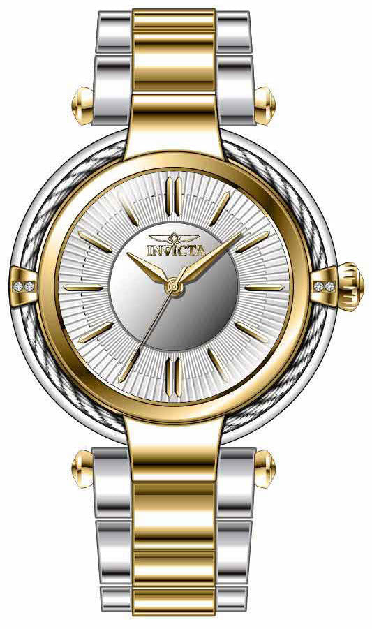 INVICTA Bolt Lady 40mm Stainless Steel Steel Silver dial PC21 Quartz , Band Material: Stainless Steel, Band Tone: Steel,Gold, Band Size [mm]: 20, Band Length [mm]: 175, Buckle Type: Fold over push button , Crown Type : Push, Case Material : Stainless Steel, Case Tone : Steel, Case Size (mm) : 40, Case Back : Solid, Material of Hands : Metal, Color of Hands : Gold, Crystal Type : Flame Fusion, Bezel Material : Stainless Steel, Dial Material : Metal, Dial Color : Silver .Purchasing these parts and having a non-authorized repair center open your watch voids all manufacturing warranties. Invicta cannot guarantee the quality standards of an altered timepiece, the standard 3-year limited warranty on Invicta timepieces shall be invalid if the timepiece is serviced at any time by an unauthorized repair center. This includes battery replacements, which must be done at an Invicta authorized repair center in order to maintain the eligibility of the warranty. Please follow the link below to learn more about Invicta's warranty.https://cdn.invictawatch.com/www/files/invicta-warranty-2018.pdf