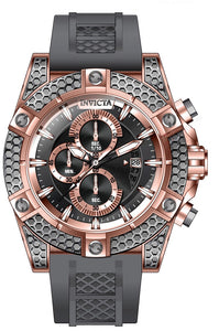 Band Material: Silicone, Band Tone: Grey, Band Width: 26MM, Band Length: 210MM, Crown Type: Push, Case Material: Stainless Steel, Case Tone: Rose Gold,Gunmetal, Case Size [mm]: 52, Case Back: Solid, Material of Hands: Metal, Color of Hands: Black,Rose Gold, Crystal Type: Flame Fusion, Bezel Material: Stainless Steel, Dial Material: Metal, Dial Color: Black .Purchasing these parts and having a non-authorized repair center open your watch voids all manufacturing warranties. Invicta cannot guarantee the quality standards of an altered timepiece, the standard 3-year limited warranty on Invicta timepieces shall be invalid if the timepiece is serviced at any time by an unauthorized repair center. This includes battery replacements, which must be done at an Invicta authorized repair center in order to maintain the eligibility of the warranty. Please follow the link below to learn more about Invicta's warranty.https://cdn.invictawatch.com/www/files/invicta-warranty-2018.pdf