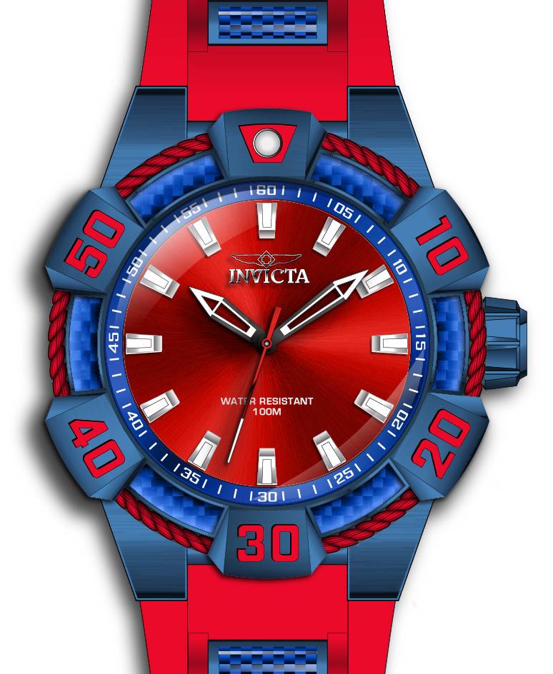 Band Material: Silicone,Glass Fiber, Band Tone: Blue,Red, Band Width: 30MM, Band Length: 210MM, Crown Type: Push, Case Material: Stainless Steel, Case Tone: Blue, Case Size [mm]: 52, Case Back: Exhibition, Material of Hands: Metal, Color of Hands: Black,Red, Crystal Type: Flame Fusion, Bezel Material: Stainless Steel,Glass Fiber,Cable, Dial Material: Metal, Dial Color: Red .Purchasing these parts and having a non-authorized repair center open your watch voids all manufacturing warranties. Invicta cannot guarantee the quality standards of an altered timepiece, the standard 3-year limited warranty on Invicta timepieces shall be invalid if the timepiece is serviced at any time by an unauthorized repair center. This includes battery replacements, which must be done at an Invicta authorized repair center in order to maintain the eligibility of the warranty. Please follow the link below to learn more about Invicta's warranty.https://cdn.invictawatch.com/www/files/invicta-warranty-2018.pdf