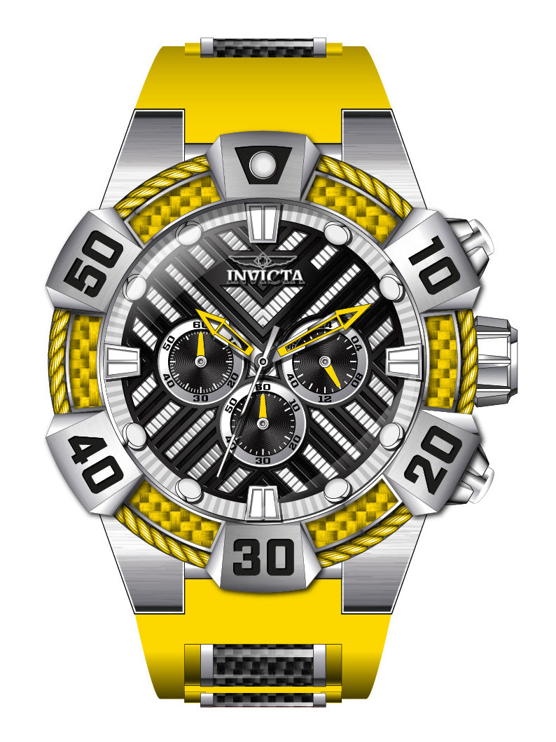 Band Material: Silicone,Carbon Fiber, Band Tone: Black,Yellow, Band Width: 30MM, Band Length: 223MM, Crown Type: Push, Case Material: Stainless Steel, Case Tone: Steel, Case Size [mm]: 52, Case Back: Solid, Material of Hands: Metal, Color of Hands: Yellow, Crystal Type: Flame Fusion, Bezel Material: Stainless Steel,Carbon Fiber,Cable, Dial Material: Metal, Dial Color: Black,Silver .Purchasing these parts and having a non-authorized repair center open your watch voids all manufacturing warranties. Invicta cannot guarantee the quality standards of an altered timepiece, the standard 3-year limited warranty on Invicta timepieces shall be invalid if the timepiece is serviced at any time by an unauthorized repair center. This includes battery replacements, which must be done at an Invicta authorized repair center in order to maintain the eligibility of the warranty. Please follow the link below to learn more about Invicta's warranty.https://cdn.invictawatch.com/www/files/invicta-warranty-2018.pdf