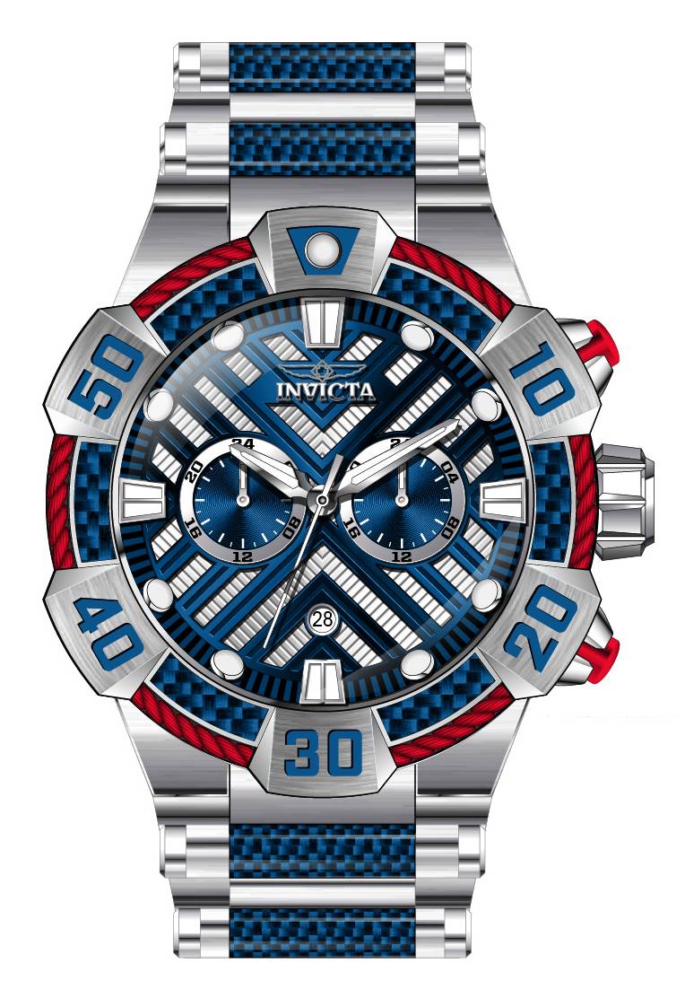Band Material: Stainless Steel,Glass Fiber, Band Tone: Steel,Blue, Band Width: 32MM, Band Length: 210MM, Crown Type: Push, Case Material: Stainless Steel, Case Tone: Steel, Case Size [mm]: 52, Case Back: Solid, Material of Hands: Metal, Color of Hands: Silver, Crystal Type: Flame Fusion, Bezel Material: Stainless Steel,Glass Fiber,Cable, Dial Material: Metal, Dial Color: Blue,Silver .Purchasing these parts and having a non-authorized repair center open your watch voids all manufacturing warranties. Invicta cannot guarantee the quality standards of an altered timepiece, the standard 3-year limited warranty on Invicta timepieces shall be invalid if the timepiece is serviced at any time by an unauthorized repair center. This includes battery replacements, which must be done at an Invicta authorized repair center in order to maintain the eligibility of the warranty. Please follow the link below to learn more about Invicta's warranty.https://cdn.invictawatch.com/www/files/invicta-warranty-2018.pdf