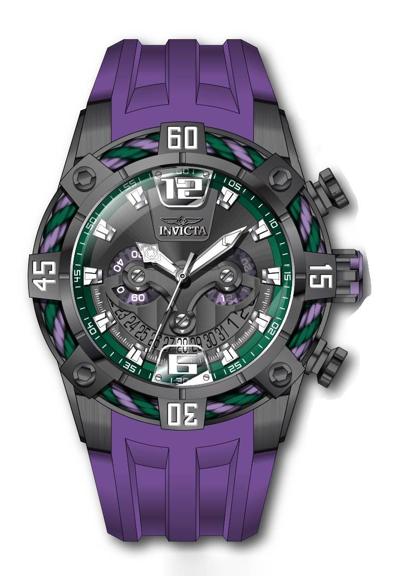 Band Material: Silicone, Band Tone: Purple, Band Width: 32MM, Band Length: 210MM, Crown Type: Push, Case Material: Stainless Steel, Case Tone: Gunmetal, Case Size [mm]: 51, Case Back: Solid, Material of Hands: Metal, Color of Hands: Silver, Crystal Type: Flame Fusion, Bezel Material: Stainless Steel,Cable, Dial Material: Metal, Dial Color: Grey,Green, Dial Pattern: None .Purchasing these parts and having a non-authorized repair center open your watch voids all manufacturing warranties. Invicta cannot guarantee the quality standards of an altered timepiece, the standard 3-year limited warranty on Invicta timepieces shall be invalid if the timepiece is serviced at any time by an unauthorized repair center. This includes battery replacements, which must be done at an Invicta authorized repair center in order to maintain the eligibility of the warranty. Please follow the link below to learn more about Invicta's warranty.https://cdn.invictawatch.com/www/files/invicta-warranty-2018.pdf