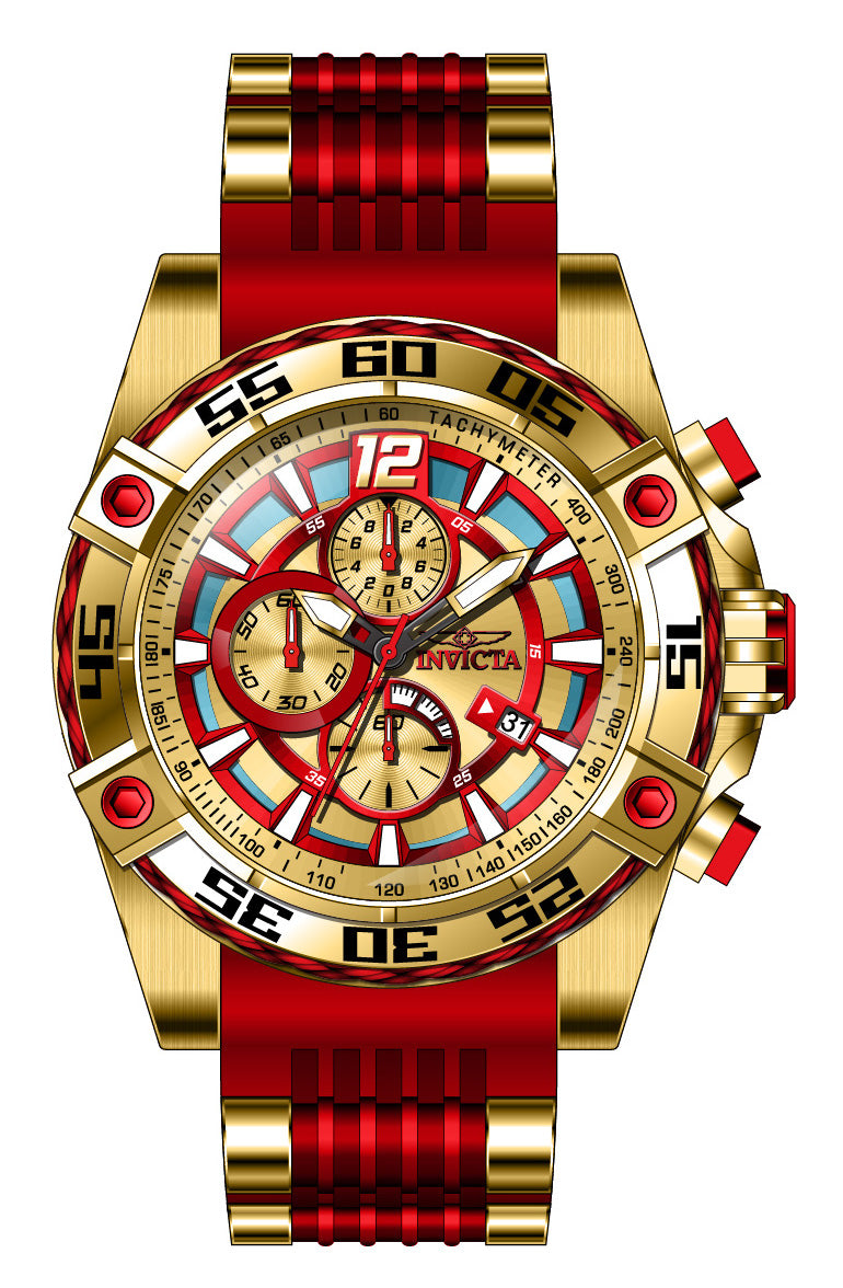 Band Material: Stainless Steel,Silicone, Band Tone: Gold,Red, Band Width: 26MM, Band Length: 200MM, Crown Type: Push, Case Material: Stainless Steel, Case Tone: Gold, Case Size [mm]: 52, Case Back: Solid, Material of Hands: Metal, Color of Hands: Black,Red, Crystal Type: Flame Fusion, Bezel Material: Stainless Steel,Cable, Dial Material: Metal, Dial Color: Blue,Red,Gold, Dial Pattern: Sun-ray Finish .Purchasing these parts and having a non-authorized repair center open your watch voids all manufacturing warranties. Invicta cannot guarantee the quality standards of an altered timepiece, the standard 3-year limited warranty on Invicta timepieces shall be invalid if the timepiece is serviced at any time by an unauthorized repair center. This includes battery replacements, which must be done at an Invicta authorized repair center in order to maintain the eligibility of the warranty. Please follow the link below to learn more about Invicta's warranty.https://cdn.invictawatch.com/www/files/invicta-warranty-2018.pdf