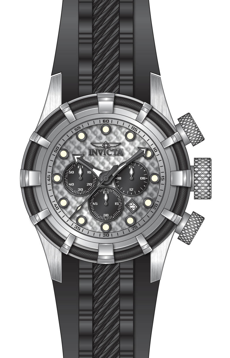 Band Material: Silicone, Band Tone: Black, Band Width: 32MM, Band Length: 210MM, Crown Type: Push, Case Material: Stainless Steel, Case Tone: Black,Steel, Case Size [mm]: 50.0, Case Back: Solid screwed, Material of Hands: Metal, Color of Hands: Luminous,Gunmetal, Crystal Type: Mineral, Bezel Material: Stainless Steel, Dial Material: Metal, Dial Color: Black,Antique Silver, Dial Pattern: Textured Pattern .Purchasing these parts and having a non-authorized repair center open your watch voids all manufacturing warranties. Invicta cannot guarantee the quality standards of an altered timepiece, the standard 3-year limited warranty on Invicta timepieces shall be invalid if the timepiece is serviced at any time by an unauthorized repair center. This includes battery replacements, which must be done at an Invicta authorized repair center in order to maintain the eligibility of the warranty. Please follow the link below to learn more about Invicta's warranty.https://cdn.invictawatch.com/www/files/invicta-warranty-2018.pdf