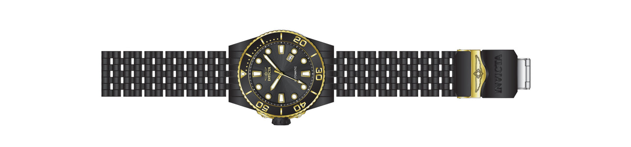 INVICTA Pro Diver Men 50.7mm Stainless Steel + Aluminum Gold + Black Black dial NH35A Automatic , Band Material: Stainless Steel, Band Tone: Black, Band Size [mm]: 26, Band Length [mm]: 210, Buckle Type: Fold over safety , Crown Type : Push, Case Material : Stainless Steel,Aluminum, Case Tone : Gold,Black, Case Size (mm) : 50.7, Case Back : Exhibition, Material of Hands : Metal, Color of Hands : Gold,Luminous, Crystal Type : Mineral, Bezel Material : Stainless Steel,Aluminum, Dial Material : Metal, Dial Color : Black, Dial Pattern : Sun-ray Finish .Purchasing these parts and having a non-authorized repair center open your watch voids all manufacturing warranties. Invicta cannot guarantee the quality standards of an altered timepiece, the standard 3-year limited warranty on Invicta timepieces shall be invalid if the timepiece is serviced at any time by an unauthorized repair center. This includes battery replacements, which must be done at an Invicta authorized repair center in order to maintain the eligibility of the warranty. Please follow the link below to learn more about Invicta's warranty.https://cdn.invictawatch.com/www/files/invicta-warranty-2018.pdf