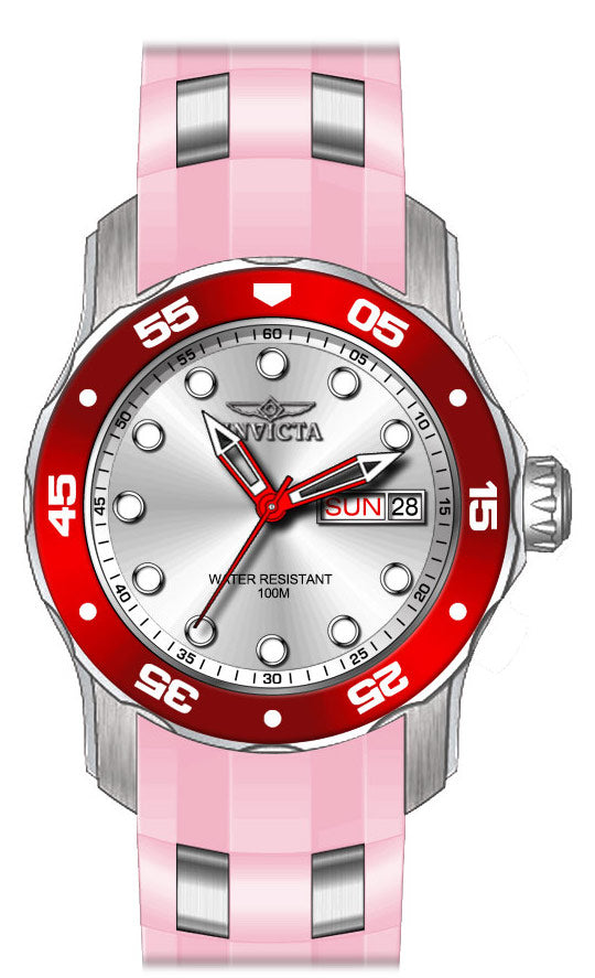 Band Material: Stainless Steel,Silicone, Band Tone: Steel,Pink, Band Width: 20MM, Band Length: 210MM, Crown Type: Push, Case Material: Stainless Steel, Case Tone: Steel, Case Size [mm]: 38, Case Back: Solid, Material of Hands: Metal, Color of Hands: Red, Crystal Type: Flame Fusion, Bezel Material: Stainless Steel,Aluminum, Dial Material: Metal, Dial Color: Silver, Dial Pattern: Textured Pattern .Purchasing these parts and having a non-authorized repair center open your watch voids all manufacturing warranties. Invicta cannot guarantee the quality standards of an altered timepiece, the standard 3-year limited warranty on Invicta timepieces shall be invalid if the timepiece is serviced at any time by an unauthorized repair center. This includes battery replacements, which must be done at an Invicta authorized repair center in order to maintain the eligibility of the warranty. Please follow the link below to learn more about Invicta's warranty.https://cdn.invictawatch.com/www/files/invicta-warranty-2018.pdf