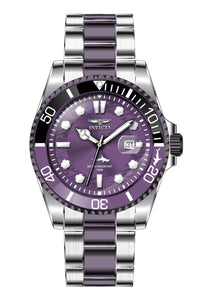 INVICTA Pro Diver Men 43mm Stainless Steel Silver Purple dial PC32 Quartz , Band Material: Stainless Steel, Band Tone: Steel,Purple, Band Size [mm]: 22, Band Length [mm]: 198, Buckle Type: Fold over safety , Crown Type : Push, Case Material : Stainless Steel, Case Tone : Silver, Case Size (mm) : 43, Case Back : Solid, Material of Hands : Metal, Color of Hands : White,Silver, Crystal Type : Flame Fusion, Bezel Material : Stainless Steel, Dial Material : Metal, Dial Color : Purple, Dial Pattern : Sun-ray Finish .Purchasing these parts and having a non-authorized repair center open your watch voids all manufacturing warranties. Invicta cannot guarantee the quality standards of an altered timepiece, the standard 3-year limited warranty on Invicta timepieces shall be invalid if the timepiece is serviced at any time by an unauthorized repair center. This includes battery replacements, which must be done at an Invicta authorized repair center in order to maintain the eligibility of the warranty. Please follow the link below to learn more about Invicta's warranty.https://cdn.invictawatch.com/www/files/invicta-warranty-2018.pdf
