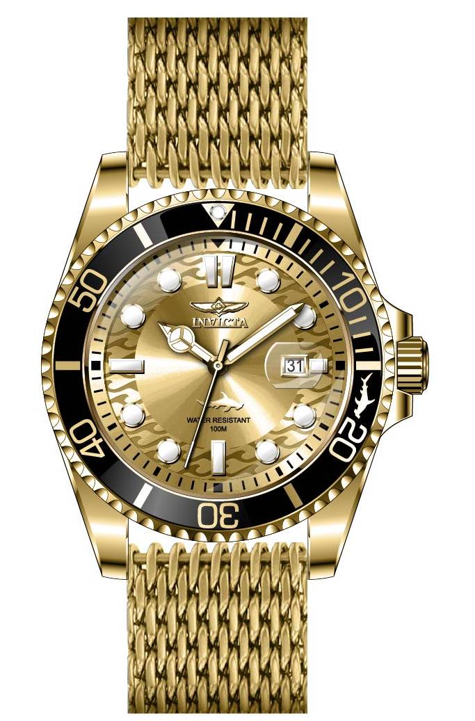 Band Material: Mesh, Band Tone: Gold, Band Width: 22MM, Band Length: 210MM, Crown Type: Screw Down, Case Material: Stainless Steel, Case Tone: Gold, Case Size [mm]: 43, Case Back: Solid, Material of Hands: Metal, Color of Hands: Gold, Crystal Type: Flame Fusion, Bezel Material: Stainless Steel,Aluminum, Dial Material: Metal, Dial Color: Gold .Purchasing these parts and having a non-authorized repair center open your watch voids all manufacturing warranties. Invicta cannot guarantee the quality standards of an altered timepiece, the standard 3-year limited warranty on Invicta timepieces shall be invalid if the timepiece is serviced at any time by an unauthorized repair center. This includes battery replacements, which must be done at an Invicta authorized repair center in order to maintain the eligibility of the warranty. Please follow the link below to learn more about Invicta's warranty.https://cdn.invictawatch.com/www/files/invicta-warranty-2018.pdf