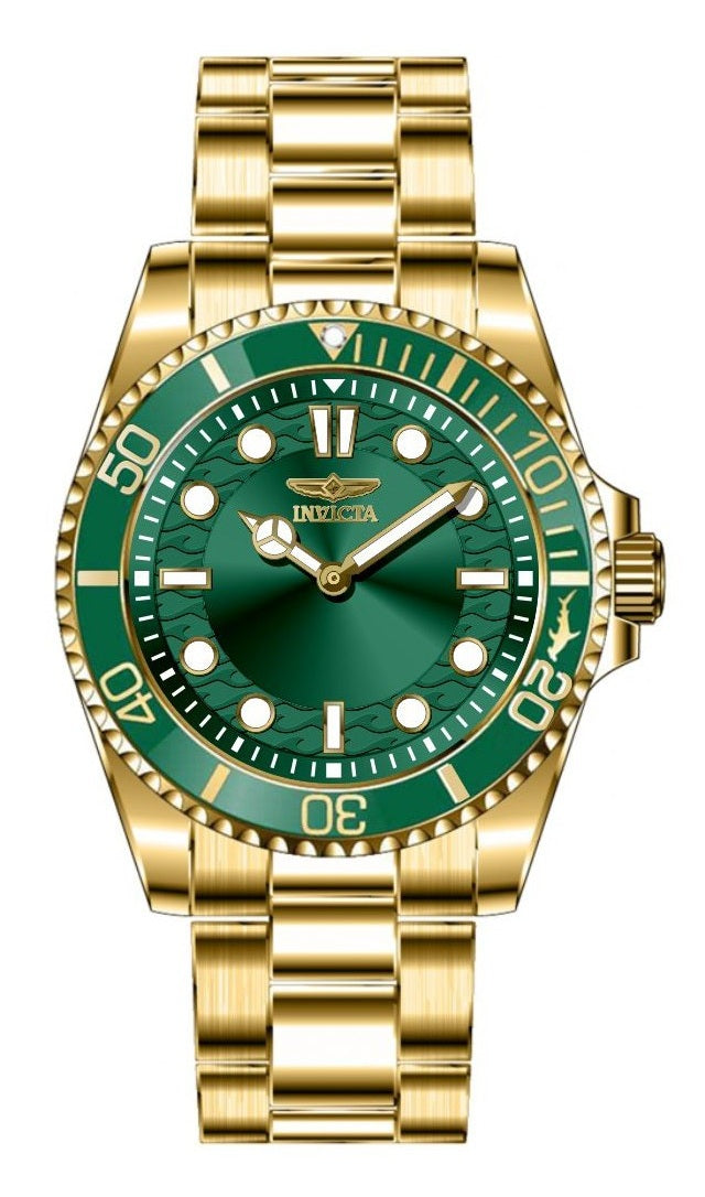 Band Material: Stainless Steel, Band Tone: Gold, Band Width: 22MM, Band Length: 185MM, Crown Type: Screw Down, Case Material: Stainless Steel, Case Tone: Gold, Case Size [mm]: 43, Case Back: Solid, Material of Hands: Brass, Color of Hands: Gold,Luminous, Crystal Type: Mineral, Bezel Material: Stainless Steel,Aluminum, Dial Material: Brass, Dial Color: Green, Dial Pattern: Sun-ray Finish .Purchasing these parts and having a non-authorized repair center open your watch voids all manufacturing warranties. Invicta cannot guarantee the quality standards of an altered timepiece, the standard 3-year limited warranty on Invicta timepieces shall be invalid if the timepiece is serviced at any time by an unauthorized repair center. This includes battery replacements, which must be done at an Invicta authorized repair center in order to maintain the eligibility of the warranty. Please follow the link below to learn more about Invicta's warranty.https://cdn.invictawatch.com/www/files/invicta-warranty-2018.pdf
