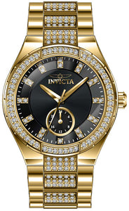 INVICTA Specialty Lady 38mm Stainless Steel Gold Black dial VH60 Quartz , Band Material: Stainless Steel,Crystal, Band Tone: Gold, Band Size [mm]: 22, Band Length [mm]: 190, Buckle Type: Fold over safety , Crown Type : Push, Case Material : Stainless Steel, Case Tone : Gold, Case Size (mm) : 38, Case Back : Solid, Material of Hands : Metal, Color of Hands : Gold, Crystal Type : Flame Fusion, Bezel Material : Stainless Steel,Crystal, Dial Material : Metal, Dial Color : Black, Dial Pattern : Sun-ray Finish .Purchasing these parts and having a non-authorized repair center open your watch voids all manufacturing warranties. Invicta cannot guarantee the quality standards of an altered timepiece, the standard 3-year limited warranty on Invicta timepieces shall be invalid if the timepiece is serviced at any time by an unauthorized repair center. This includes battery replacements, which must be done at an Invicta authorized repair center in order to maintain the eligibility of the warranty. Please follow the link below to learn more about Invicta's warranty.https://cdn.invictawatch.com/www/files/invicta-warranty-2018.pdf