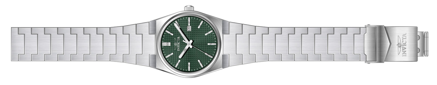 Band Material: Stainless Steel, Band Tone: Steel, Band Width: 27MM, Band Length: 185MM, Crown Type: Push, Case Material: Stainless Steel, Case Tone: Steel, Case Size [mm]: 40, Color of Hands: Luminous, Silver, Crystal Type: Mineral, Bezel Material: None, Dial Material: Brass, Dial Color: Green .Purchasing these parts and having a non-authorized repair center open your watch voids all manufacturing warranties. Invicta cannot guarantee the quality standards of an altered timepiece, the standard 3-year limited warranty on Invicta timepieces shall be invalid if the timepiece is serviced at any time by an unauthorized repair center. This includes battery replacements, which must be done at an Invicta authorized repair center in order to maintain the eligibility of the warranty. Please follow the link below to learn more about Invicta's warranty.https://cdn.invictawatch.com/www/files/invicta-warranty-2018.pdf