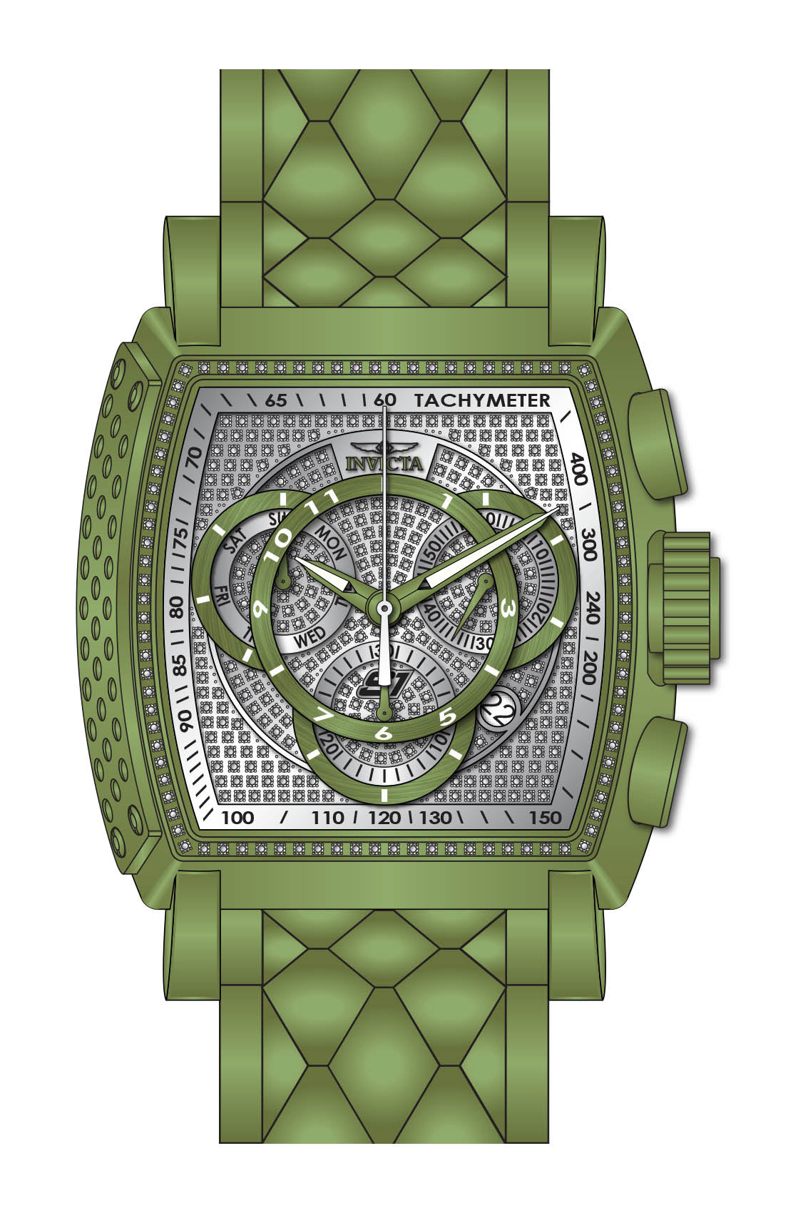 Band Material: Stainless Steel, Band Tone: Light Green, Band Size [mm]: 26, Band Length [mm]: 210, Buckle Type: Fold over safety . Please note that bands do not ship with spring bars or T bars. If you need these parts, please add them to your cart with the corresponding part sku.