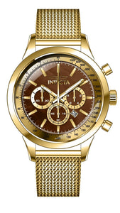 INVICTA Aviator Men 54mm Stainless Steel Gold Brown dial 6S20 Quartz , Band Material: Stainless Steel, Band Tone: Gold, Band Size [mm]: 24, Band Length [mm]: 185, Buckle Type: Buckle , Crown Type : Push, Case Material : Stainless Steel, Case Tone : Gold, Case Size (mm) : 54, Case Back : Solid, Material of Hands : Metal, Color of Hands : Gold, Crystal Type : Flame Fusion, Bezel Material : Stainless Steel, Dial Material : Mother of Pearl, Dial Color : Brown .Purchasing these parts and having a non-authorized repair center open your watch voids all manufacturing warranties. Invicta cannot guarantee the quality standards of an altered timepiece, the standard 3-year limited warranty on Invicta timepieces shall be invalid if the timepiece is serviced at any time by an unauthorized repair center. This includes battery replacements, which must be done at an Invicta authorized repair center in order to maintain the eligibility of the warranty. Please follow the link below to learn more about Invicta's warranty.https://cdn.invictawatch.com/www/files/invicta-warranty-2018.pdf