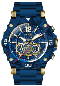 INVICTA Aviator Men 52mm Stainless Steel Blue Blue+White+Gold dial JS50 Quartz , Band Material: Stainless Steel, Band Tone: Gold,Blue, Band Size [mm]: 31, Band Length [mm]: 198, Buckle Type: Fold over safety , Crown Type : Push, Case Material : Stainless Steel, Case Tone : Blue, Case Size (mm) : 52, Case Back : Solid, Material of Hands : Metal, Color of Hands : White,Gold, Crystal Type : Flame Fusion, Bezel Material : Stainless Steel, Dial Material : Glass Fiber, Dial Color : Blue,White,Gold .Purchasing these parts and having a non-authorized repair center open your watch voids all manufacturing warranties. Invicta cannot guarantee the quality standards of an altered timepiece, the standard 3-year limited warranty on Invicta timepieces shall be invalid if the timepiece is serviced at any time by an unauthorized repair center. This includes battery replacements, which must be done at an Invicta authorized repair center in order to maintain the eligibility of the warranty. Please follow the link below to learn more about Invicta's warranty.https://cdn.invictawatch.com/www/files/invicta-warranty-2018.pdf