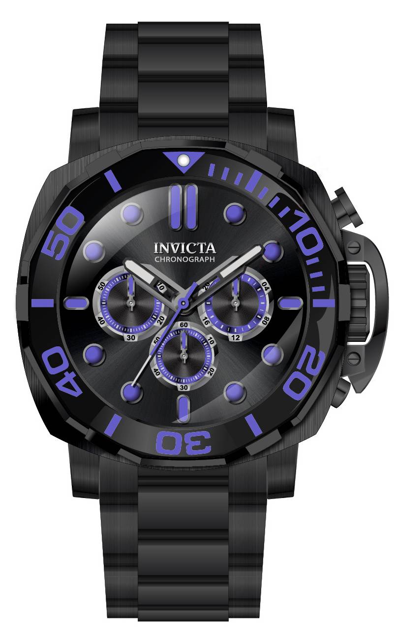 Band Material: Stainless Steel, Band Tone: Black, Band Width: 24MM, Band Length: 185MM, Crown Type: Push, Case Material: Stainless Steel, Case Tone: Black, Case Size [mm]: 48, Case Back: Solid, Material of Hands: Metal, Color of Hands: Purple,Grey, Crystal Type: Flame Fusion, Bezel Material: Stainless Steel,Aluminum, Dial Material: Metal, Dial Color: Black, Dial Pattern: None .Purchasing these parts and having a non-authorized repair center open your watch voids all manufacturing warranties. Invicta cannot guarantee the quality standards of an altered timepiece, the standard 3-year limited warranty on Invicta timepieces shall be invalid if the timepiece is serviced at any time by an unauthorized repair center. This includes battery replacements, which must be done at an Invicta authorized repair center in order to maintain the eligibility of the warranty. Please follow the link below to learn more about Invicta's warranty.https://cdn.invictawatch.com/www/files/invicta-warranty-2018.pdf