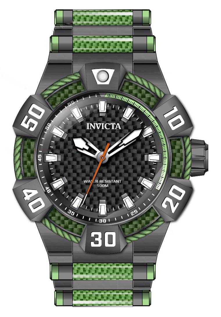 Band Material: Stainless Steel,Glass Fiber, Band Tone: Gunmetal,Green, Band Width: 32MM, Band Length: 190MM, Crown Type: Push, Case Material: Stainless Steel, Case Tone: Gunmetal, Case Size [mm]: 52, Case Back: Exhibition, Material of Hands: Metal, Color of Hands: Silver,Red,Orange, Crystal Type: Flame Fusion, Bezel Material: Stainless Steel,Glass Fiber,Cable, Dial Material: Carbon Fiber, Dial Color: Black .Purchasing these parts and having a non-authorized repair center open your watch voids all manufacturing warranties. Invicta cannot guarantee the quality standards of an altered timepiece, the standard 3-year limited warranty on Invicta timepieces shall be invalid if the timepiece is serviced at any time by an unauthorized repair center. This includes battery replacements, which must be done at an Invicta authorized repair center in order to maintain the eligibility of the warranty. Please follow the link below to learn more about Invicta's warranty.https://cdn.invictawatch.com/www/files/invicta-warranty-2018.pdf