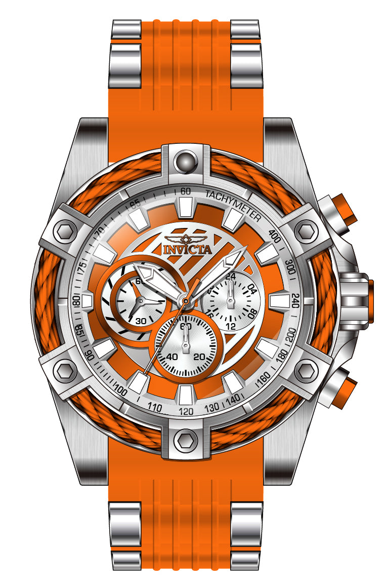 Band Material: Stainless Steel,Silicone, Band Tone: Steel,Orange, Band Width: 26MM, Band Length: 200MM, Crown Type: Push, Case Material: Stainless Steel, Case Tone: Steel, Case Size [mm]: 52, Case Back: Solid, Material of Hands: Metal, Color of Hands: Silver,Orange, Crystal Type: Flame Fusion, Bezel Material: Stainless Steel,Cable, Dial Material: Metal, Dial Color: Silver,Orange, Dial Pattern: Sun-ray Finish .Purchasing these parts and having a non-authorized repair center open your watch voids all manufacturing warranties. Invicta cannot guarantee the quality standards of an altered timepiece, the standard 3-year limited warranty on Invicta timepieces shall be invalid if the timepiece is serviced at any time by an unauthorized repair center. This includes battery replacements, which must be done at an Invicta authorized repair center in order to maintain the eligibility of the warranty. Please follow the link below to learn more about Invicta's warranty.https://cdn.invictawatch.com/www/files/invicta-warranty-2018.pdf