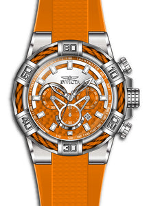 Band Material: Silicone, Band Tone: Orange, Band Width: 32MM, Band Length: 210MM, Crown Type: Push, Case Material: Stainless Steel, Case Tone: Steel, Case Size [mm]: 52.0, Case Back: Solid, Material of Hands: Metal, Color of Hands: Silver, Crystal Type: Flame Fusion, Bezel Material: Stainless Steel,Cable, Dial Material: Metal,Glass Fiber, Dial Color: Silver,Orange, Dial Pattern: None .Purchasing these parts and having a non-authorized repair center open your watch voids all manufacturing warranties. Invicta cannot guarantee the quality standards of an altered timepiece, the standard 3-year limited warranty on Invicta timepieces shall be invalid if the timepiece is serviced at any time by an unauthorized repair center. This includes battery replacements, which must be done at an Invicta authorized repair center in order to maintain the eligibility of the warranty. Please follow the link below to learn more about Invicta's warranty.https://cdn.invictawatch.com/www/files/invicta-warranty-2018.pdf