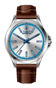 Band Material: Leather, Band Tone: Brown, Band Width: 20MM, Band Length: 210MM, Crown Type: Push, Case Material: Stainless Steel, Case Tone: Steel, Case Size [mm]: 43, Case Back: Solid, Material of Hands: Brass, Color of Hands: Blue, Crystal Type: Mineral, Bezel Material: None, Dial Material: Brass, Dial Color: Silver, Dial Pattern: Sun-ray Finish .Purchasing these parts and having a non-authorized repair center open your watch voids all manufacturing warranties. Invicta cannot guarantee the quality standards of an altered timepiece, the standard 3-year limited warranty on Invicta timepieces shall be invalid if the timepiece is serviced at any time by an unauthorized repair center. This includes battery replacements, which must be done at an Invicta authorized repair center in order to maintain the eligibility of the warranty. Please follow the link below to learn more about Invicta's warranty.https://cdn.invictawatch.com/www/files/invicta-warranty-2018.pdf