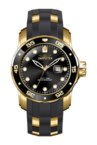 INVICTA Pro Diver Men 48mm Stainless Steel Gold Black dial PC32 Quartz , Band Material: Silicone, Band Tone: Gold,Black, Band Size [mm]: 26, Band Length [mm]: 210, Buckle Type: Buckle , Crown Type : Push, Case Material : Stainless Steel, Case Tone : Gold, Case Size (mm) : 48, Case Back : Solid, Material of Hands : Metal, Color of Hands : White,Gold, Crystal Type : Flame Fusion, Bezel Material : Stainless Steel, Dial Material : Metal, Dial Color : Black, Dial Pattern : Sun-ray Finish .Purchasing these parts and having a non-authorized repair center open your watch voids all manufacturing warranties. Invicta cannot guarantee the quality standards of an altered timepiece, the standard 3-year limited warranty on Invicta timepieces shall be invalid if the timepiece is serviced at any time by an unauthorized repair center. This includes battery replacements, which must be done at an Invicta authorized repair center in order to maintain the eligibility of the warranty. Please follow the link below to learn more about Invicta's warranty.https://cdn.invictawatch.com/www/files/invicta-warranty-2018.pdf