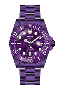 INVICTA Pro Diver Men 43mm Stainless Steel Purple Purple dial PC32 Quartz , Band Material: Stainless Steel, Band Tone: Purple, Band Size [mm]: 22, Band Length [mm]: 198, Buckle Type: Fold over safety , Crown Type : Push, Case Material : Stainless Steel, Case Tone : Purple, Case Size (mm) : 43, Case Back : Solid, Material of Hands : Metal, Color of Hands : White,Silver, Crystal Type : Flame Fusion, Bezel Material : Stainless Steel, Dial Material : Metal, Dial Color : Purple, Dial Pattern : Sun-ray Finish .Purchasing these parts and having a non-authorized repair center open your watch voids all manufacturing warranties. Invicta cannot guarantee the quality standards of an altered timepiece, the standard 3-year limited warranty on Invicta timepieces shall be invalid if the timepiece is serviced at any time by an unauthorized repair center. This includes battery replacements, which must be done at an Invicta authorized repair center in order to maintain the eligibility of the warranty. Please follow the link below to learn more about Invicta's warranty.https://cdn.invictawatch.com/www/files/invicta-warranty-2018.pdf