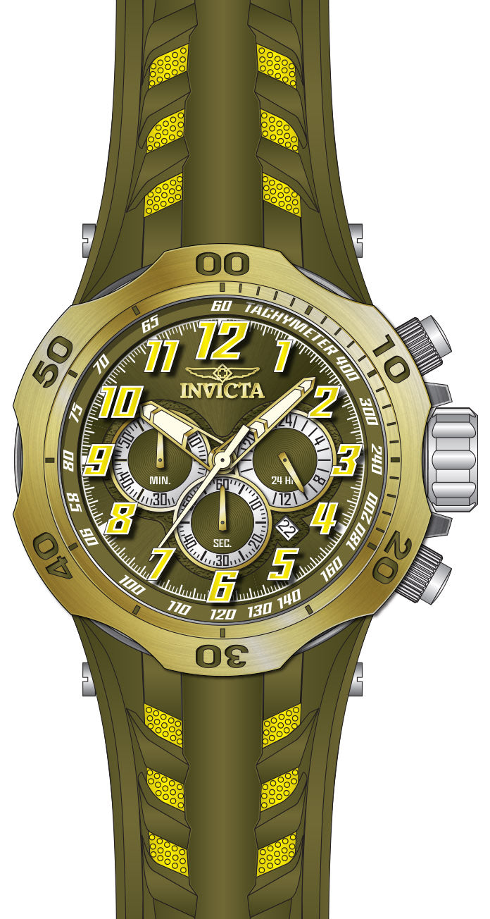Band Material: Silicone, Band Tone: Yellow,Green, Band Width: 38MM, Band Length: 210MM, Crown Type: Screw Down, Case Material: Stainless Steel, Case Tone: Gold,Steel, Case Size [mm]: 52.0, Case Back: Solid screwed, Material of Hands: Metal, Color of Hands: Gold,Luminous, Crystal Type: Mineral, Bezel Material: Stainless Steel, Dial Material: Metal, Dial Color: White,Military Green, Dial Pattern: Sun-ray Finish .Purchasing these parts and having a non-authorized repair center open your watch voids all manufacturing warranties. Invicta cannot guarantee the quality standards of an altered timepiece, the standard 3-year limited warranty on Invicta timepieces shall be invalid if the timepiece is serviced at any time by an unauthorized repair center. This includes battery replacements, which must be done at an Invicta authorized repair center in order to maintain the eligibility of the warranty. Please follow the link below to learn more about Invicta's warranty.https://cdn.invictawatch.com/www/files/invicta-warranty-2018.pdf