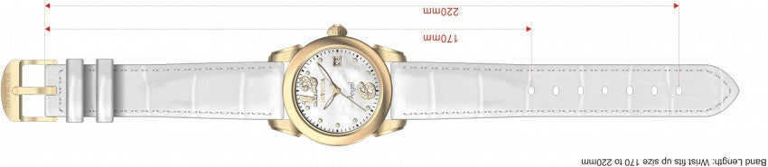 Band For Lady Invicta Angel 0774, Band Material Leather, Band Color White, Band Width 20 MM, Band Length 220 MM, Buckle Type Regular, Clasp Type Regular. Please note that bands do not ship with spring bars or T bars. If you need these parts, please add them to your cart with the corresponding part sku.