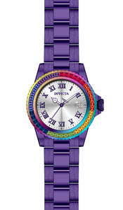 INVICTA Angel Lady 40mm Stainless Steel Purple + Iridescent Silver dial 515 Quartz , Band Material: Stainless Steel, Band Tone: Purple, Band Size [mm]: 20, Band Length [mm]: 200, Buckle Type: Fold over safety , Crown Type : Screw Down, Case Material : Stainless Steel, Case Tone : Purple,Iridescent, Case Size (mm) : 40, Case Back : Solid, Material of Hands : Metal, Color of Hands : Purple,Luminous, Crystal Type : Mineral, Bezel Material : Stainless Steel, Dial Material : Metal, Dial Color : Silver, Dial Pattern : Sun-ray Finish .Purchasing these parts and having a non-authorized repair center open your watch voids all manufacturing warranties. Invicta cannot guarantee the quality standards of an altered timepiece, the standard 3-year limited warranty on Invicta timepieces shall be invalid if the timepiece is serviced at any time by an unauthorized repair center. This includes battery replacements, which must be done at an Invicta authorized repair center in order to maintain the eligibility of the warranty. Please follow the link below to learn more about Invicta's warranty.https://cdn.invictawatch.com/www/files/invicta-warranty-2018.pdf
