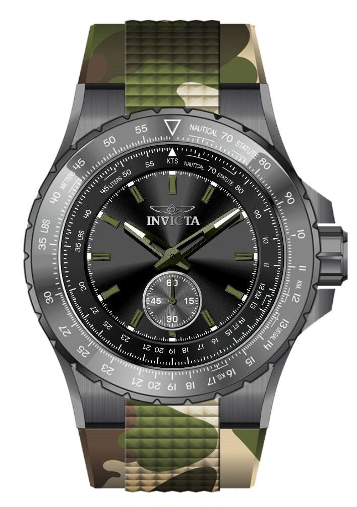 Band Material: Silicone, Band Tone: Camouflage, Band Width: 32.5MM, Band Length: 225MM, Crown Type: Push, Case Material: Stainless Steel, Case Tone: Gunmetal, Case Size [mm]: 50, Case Back: Solid, Material of Hands: Brass, Color of Hands: Green,Luminous, Crystal Type: Mineral, Bezel Material: Stainless Steel,Aluminum, Dial Material: Brass, Dial Color: Black, Dial Pattern: Sun-ray Finish .Purchasing these parts and having a non-authorized repair center open your watch voids all manufacturing warranties. Invicta cannot guarantee the quality standards of an altered timepiece, the standard 3-year limited warranty on Invicta timepieces shall be invalid if the timepiece is serviced at any time by an unauthorized repair center. This includes battery replacements, which must be done at an Invicta authorized repair center in order to maintain the eligibility of the warranty. Please follow the link below to learn more about Invicta's warranty.https://cdn.invictawatch.com/www/files/invicta-warranty-2018.pdf