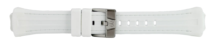Band Material: Silicone, Band Tone: White with White Stitching and Baby Blue Back, Band Size: 15 mm, Band Length: 183mm, Clasp Type: Buckle, Clasp Tone: Stainless Steel Please note that bands do not ship with spring bars or T bars. If you need these parts, please add them to your cart with the corresponding part sku.