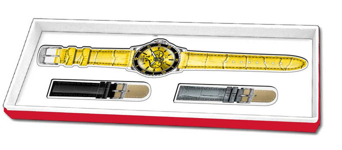 Band Material: Leather, Band Tone: Yellow, Black or Grey, Band Size [mm]: 24, Band Length [mm]: 210, Buckle Type: Buckle . Please note that bands do not ship with spring bars or T bars. If you need these parts, please add them to your cart with the corresponding part sku.