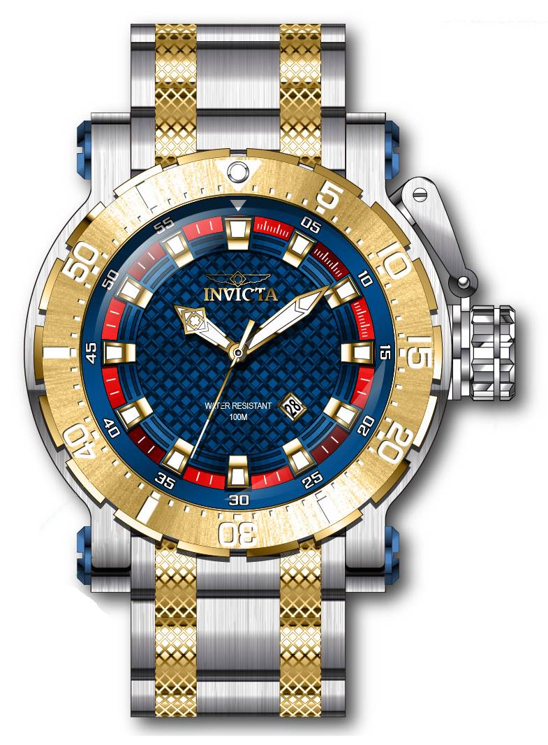 Band Material: Stainless Steel, Band Tone: Steel,Gold, Band Width: 26MM, Band Length: 198MM, Crown Type: Push, Case Material: Stainless Steel, Case Tone: Steel, Case Size [mm]: 52, Case Back: Solid, Material of Hands: Metal, Color of Hands: Gold, Crystal Type: Flame Fusion, Bezel Material: Stainless Steel, Dial Material: Metal, Dial Color: Blue, Dial Pattern: Textured Pattern .Purchasing these parts and having a non-authorized repair center open your watch voids all manufacturing warranties. Invicta cannot guarantee the quality standards of an altered timepiece, the standard 3-year limited warranty on Invicta timepieces shall be invalid if the timepiece is serviced at any time by an unauthorized repair center. This includes battery replacements, which must be done at an Invicta authorized repair center in order to maintain the eligibility of the warranty. Please follow the link below to learn more about Invicta's warranty.https://cdn.invictawatch.com/www/files/invicta-warranty-2018.pdf