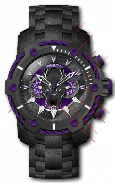 Band Material: Stainless Steel, Band Tone: Black, Band Width: 26MM, Band Length: 190MM, Crown Type: Push, Case Material: Stainless Steel, Case Tone: Black, Case Size [mm]: 51.5, Color of Hands: Purple, White, Crystal Type: Flame Fusion, Bezel Material: Stainless Steel, Dial Material: Metal, Dial Color: Purple, Black .Purchasing these parts and having a non-authorized repair center open your watch voids all manufacturing warranties. Invicta cannot guarantee the quality standards of an altered timepiece, the standard 3-year limited warranty on Invicta timepieces shall be invalid if the timepiece is serviced at any time by an unauthorized repair center. This includes battery replacements, which must be done at an Invicta authorized repair center in order to maintain the eligibility of the warranty. Please follow the link below to learn more about Invicta's warranty.https://cdn.invictawatch.com/www/files/invicta-warranty-2018.pdf