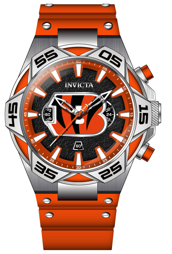 Band Material: Silicone, Stainless Steel, Band Tone: Orange, Steel, Band Width: 30MM, Band Length: 210MM, Crown Type: Push, Case Material: Stainless Steel, Case Tone: Silver, Case Size [mm]: 52, Color of Hands: Orange, Silver, White, Crystal Type: Flame Fusion, Bezel Material: Stainless Steel, Dial Material: Metal, Dial Color: Orange, White, Black .Purchasing these parts and having a non-authorized repair center open your watch voids all manufacturing warranties. Invicta cannot guarantee the quality standards of an altered timepiece, the standard 3-year limited warranty on Invicta timepieces shall be invalid if the timepiece is serviced at any time by an unauthorized repair center. This includes battery replacements, which must be done at an Invicta authorized repair center in order to maintain the eligibility of the warranty. Please follow the link below to learn more about Invicta's warranty.https://cdn.invictawatch.com/www/files/invicta-warranty-2018.pdf
