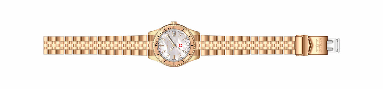 INVICTA Pro Diver Swiss Made Lady 34mm Stainless Steel Rose Gold White dial 505 Quartz , Band Material: Stainless Steel, Band Tone: Rose Gold, Band Size [mm]: 16, Band Length [mm]: 190, Buckle Type: Fold over safety , Crown Type : Push, Case Material : Stainless Steel, Case Tone : Rose Gold, Case Size (mm) : 34, Case Back : Solid, Material of Hands : Metal, Color of Hands : Rose Gold,Luminous, Crystal Type : Flame Fusion, Bezel Material : Stainless Steel, Dial Material : Mother of Pearl, Dial Color : White, Dial Pattern : None .Purchasing these parts and having a non-authorized repair center open your watch voids all manufacturing warranties. Invicta cannot guarantee the quality standards of an altered timepiece, the standard 3-year limited warranty on Invicta timepieces shall be invalid if the timepiece is serviced at any time by an unauthorized repair center. This includes battery replacements, which must be done at an Invicta authorized repair center in order to maintain the eligibility of the warranty. Please follow the link below to learn more about Invicta's warranty.https://cdn.invictawatch.com/www/files/invicta-warranty-2018.pdf