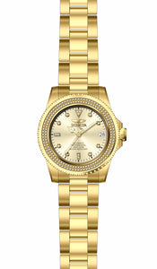 INVICTA Pro Diver Lady 36mm Stainless Steel Gold Champagne dial NH35A Automatic , Band Material: Stainless Steel, Band Tone: Gold, Band Size [mm]: 18, Band Length [mm]: 190, Buckle Type: Fold over safety , Crown Type : Screw Down, Case Material : Stainless Steel, Case Tone : Gold, Case Size (mm) : 36, Case Back : Exhibition, Material of Hands : Metal, Color of Hands : Gold,Luminous, Crystal Type : Mineral, Bezel Material : Stainless Steel, Dial Material : Metal, Dial Color : Champagne, Dial Pattern : Sun-ray Finish .Purchasing these parts and having a non-authorized repair center open your watch voids all manufacturing warranties. Invicta cannot guarantee the quality standards of an altered timepiece, the standard 3-year limited warranty on Invicta timepieces shall be invalid if the timepiece is serviced at any time by an unauthorized repair center. This includes battery replacements, which must be done at an Invicta authorized repair center in order to maintain the eligibility of the warranty. Please follow the link below to learn more about Invicta's warranty.https://cdn.invictawatch.com/www/files/invicta-warranty-2018.pdf