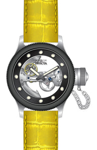 Band Material: Leather, Band Tone: Yellow, Band Width: 26MM, Band Length: 210MM, Crown Type: Push, Case Material: Stainless Steel, Case Tone: Black,Silver, Case Size [mm]: 52, Case Back: Exhibition, Material of Hands: Metal, Color of Hands: Luminous,Gunmetal, Crystal Type: Mineral, Bezel Material: Stainless Steel, Dial Material: Metal,Skeleton, Dial Color: Black .Purchasing these parts and having a non-authorized repair center open your watch voids all manufacturing warranties. Invicta cannot guarantee the quality standards of an altered timepiece, the standard 3-year limited warranty on Invicta timepieces shall be invalid if the timepiece is serviced at any time by an unauthorized repair center. This includes battery replacements, which must be done at an Invicta authorized repair center in order to maintain the eligibility of the warranty. Please follow the link below to learn more about Invicta's warranty.https://cdn.invictawatch.com/www/files/invicta-warranty-2018.pdf