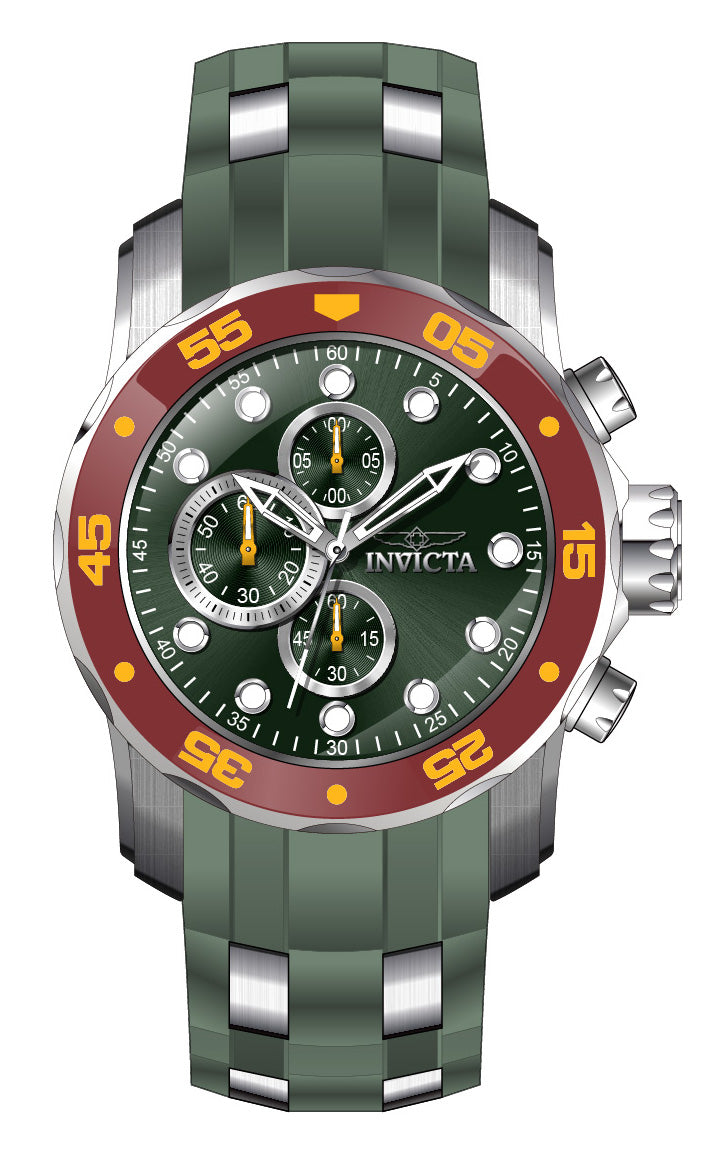 Band Material: Stainless Steel,Silicone, Band Tone: Steel,Green, Band Width: 26MM, Band Length: 210MM, Crown Type: Push, Case Material: Stainless Steel, Case Tone: Steel, Case Size [mm]: 48, Case Back: Solid, Material of Hands: Metal, Color of Hands: Silver,Orange, Crystal Type: Flame Fusion, Bezel Material: Stainless Steel,Aluminum, Dial Material: Metal, Dial Color: Green .Purchasing these parts and having a non-authorized repair center open your watch voids all manufacturing warranties. Invicta cannot guarantee the quality standards of an altered timepiece, the standard 3-year limited warranty on Invicta timepieces shall be invalid if the timepiece is serviced at any time by an unauthorized repair center. This includes battery replacements, which must be done at an Invicta authorized repair center in order to maintain the eligibility of the warranty. Please follow the link below to learn more about Invicta's warranty.https://cdn.invictawatch.com/www/files/invicta-warranty-2018.pdf