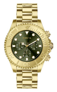 Band Material: Stainless Steel, Band Tone: Gold, Band Width: 22MM, Band Length: 185MM, Crown Type: Screw Down, Case Material: Stainless Steel, Case Tone: Gold, Case Size [mm]: 47, Case Back: Solid, Material of Hands: Brass, Color of Hands: Gold,Luminous, Crystal Type: Mineral, Bezel Material: Stainless Steel, Dial Material: Brass, Dial Color: Military Green, Dial Pattern: Sun-ray Finish .Purchasing these parts and having a non-authorized repair center open your watch voids all manufacturing warranties. Invicta cannot guarantee the quality standards of an altered timepiece, the standard 3-year limited warranty on Invicta timepieces shall be invalid if the timepiece is serviced at any time by an unauthorized repair center. This includes battery replacements, which must be done at an Invicta authorized repair center in order to maintain the eligibility of the warranty. Please follow the link below to learn more about Invicta's warranty.https://cdn.invictawatch.com/www/files/invicta-warranty-2018.pdf