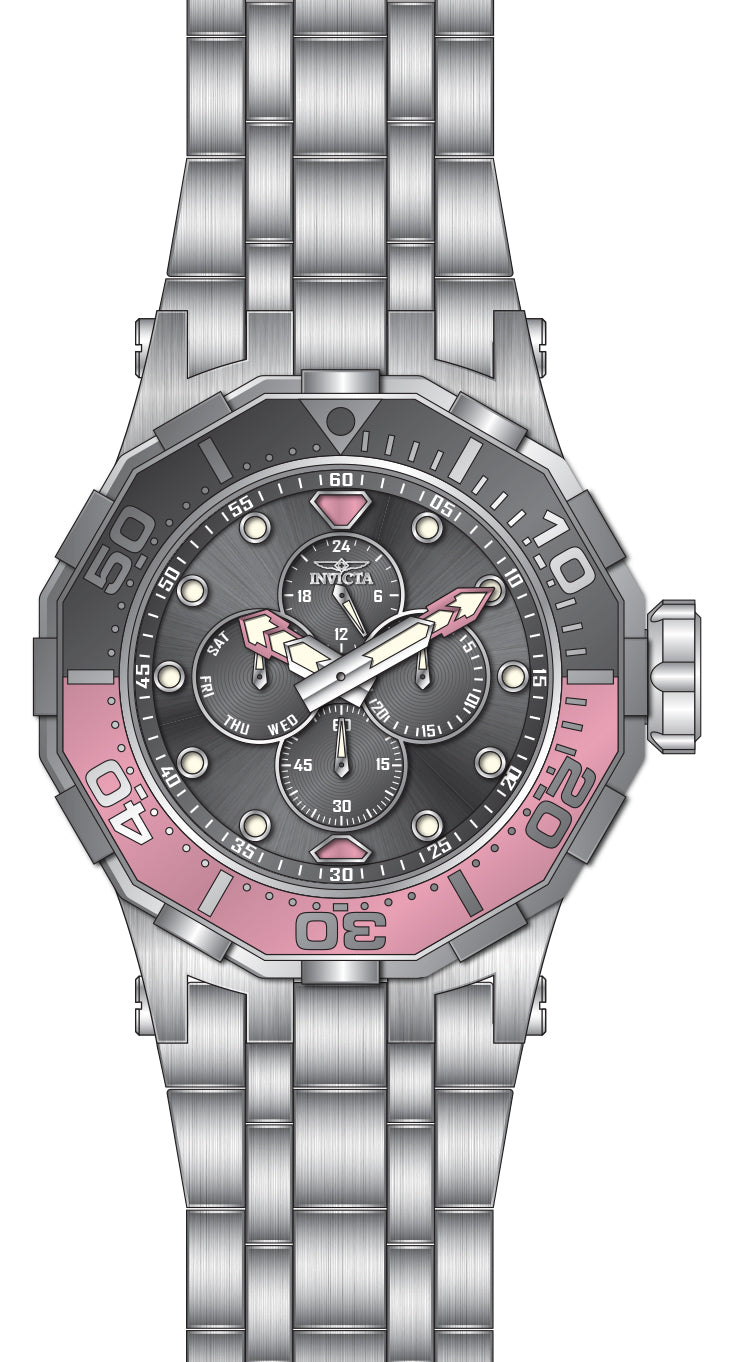 Band Material: Stainless Steel, Band Tone: Steel, Band Width: 31.0MM, Band Length: 210MM, Crown Type: Push, Case Material: Stainless Steel,Aluminum, Case Tone: Pink,Silver,Light Grey,Steel, Case Size [mm]: 52.00, Case Back: Solid screwed, Material of Hands: Metal, Color of Hands: Silver,Luminous,Pink, Crystal Type: Mineral, Bezel Material: Stainless Steel,Aluminum, Dial Material: Metal, Dial Color: Gunmetal, Dial Pattern: Textured Pattern .Purchasing these parts and having a non-authorized repair center open your watch voids all manufacturing warranties. Invicta cannot guarantee the quality standards of an altered timepiece, the standard 3-year limited warranty on Invicta timepieces shall be invalid if the timepiece is serviced at any time by an unauthorized repair center. This includes battery replacements, which must be done at an Invicta authorized repair center in order to maintain the eligibility of the warranty. Please follow the link below to learn more about Invicta's warranty.https://cdn.invictawatch.com/www/files/invicta-warranty-2018.pdf