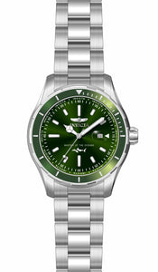 INVICTA Pro Diver Men 46mm Stainless Steel Steel Green dial PC32 Quartz , Band Material: Stainless Steel, Band Tone: Steel, Band Size [mm]: 22, Band Length [mm]: 215, Buckle Type: Fold over safety , Crown Type : Push, Case Material : Stainless Steel, Case Tone : Steel, Case Size (mm) : 46, Case Back : Solid, Material of Hands : Metal, Color of Hands : Silver,Luminous, Crystal Type : Flame Fusion, Bezel Material : Stainless Steel, Dial Material : Metal, Dial Color : Green, Dial Pattern : Sun-ray Finish .Purchasing these parts and having a non-authorized repair center open your watch voids all manufacturing warranties. Invicta cannot guarantee the quality standards of an altered timepiece, the standard 3-year limited warranty on Invicta timepieces shall be invalid if the timepiece is serviced at any time by an unauthorized repair center. This includes battery replacements, which must be done at an Invicta authorized repair center in order to maintain the eligibility of the warranty. Please follow the link below to learn more about Invicta's warranty.https://cdn.invictawatch.com/www/files/invicta-warranty-2018.pdf