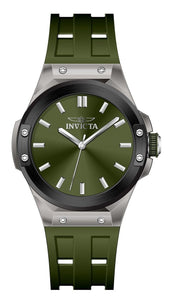 Band Material: Silicone, Band Tone: Green, Band Width: 26MM, Band Length: 220MM, Crown Type: Push, Case Material: Plastic, Case Tone: Transparent, Case Size [mm]: 45, Case Back: Solid, Material of Hands: Aluminum, Color of Hands: Silver, Crystal Type: Mineral, Bezel Material: Stainless Steel, Dial Material: Brass, Dial Color: Green, Dial Pattern: Sun-ray Finish .Purchasing these parts and having a non-authorized repair center open your watch voids all manufacturing warranties. Invicta cannot guarantee the quality standards of an altered timepiece, the standard 3-year limited warranty on Invicta timepieces shall be invalid if the timepiece is serviced at any time by an unauthorized repair center. This includes battery replacements, which must be done at an Invicta authorized repair center in order to maintain the eligibility of the warranty. Please follow the link below to learn more about Invicta's warranty.https://cdn.invictawatch.com/www/files/invicta-warranty-2018.pdf
