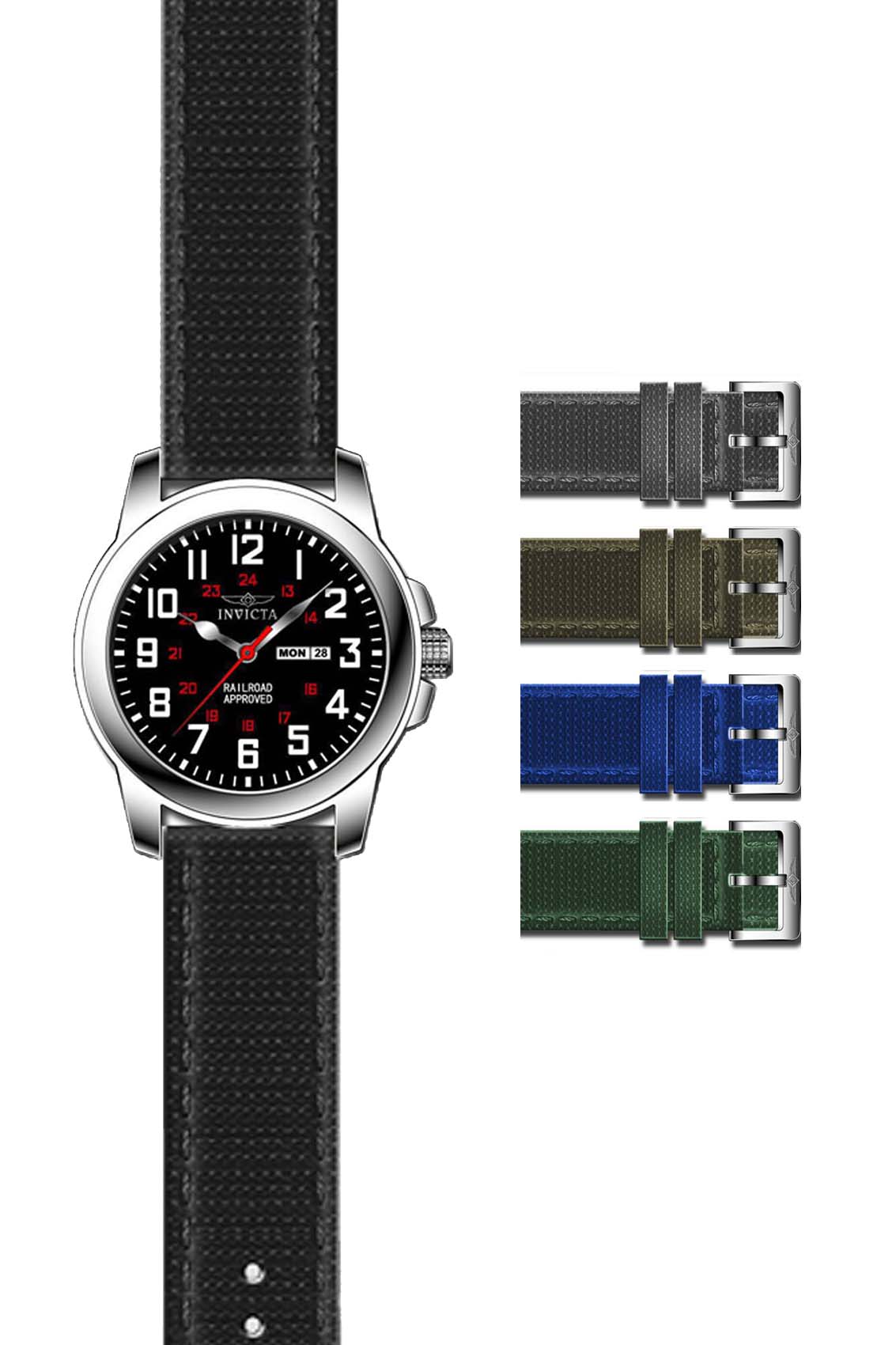 Individual Spare PARTS For Men Invicta Specialty 1552, Band Material Nylon, Band Colors Black, Grey, Olive Green, Blue, Green. Band Width 22 MM, Band Length 226 MM, Buckle Type Regular, Clasp Type Regular, Crown Type Push, Case Material Stainless Steel, Case Tone Steel, Case Size (mm) 44, Case Back Solid, Material of Hands Metal, Color of Hands Silver, Red, Crystal Type Mineral, Bezel Material Stainless Steel, Dial Material Metal, Dial Color Black, Dial Pattern None. Purchasing these parts and having a non-authorized repair center open your watch voids all manufacturing warranties. Invicta cannot guarantee the quality standards of an altered timepiece, the standard 3-year limited warranty on Invicta timepieces shall be invalid if the timepiece is serviced at any time by an unauthorized repair center. This includes battery replacements, which must be done at an Invicta authorized repair center in order to maintain the eligibility of the warranty. Please follow the link below to learn more about Invicta's warranty.https://cdn.invictawatch.com/www/files/invicta-warranty-2018.pdf