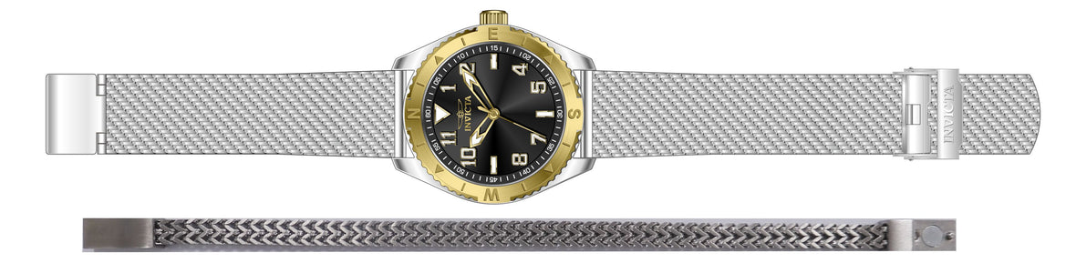 Band Material: Stainless Steel, Band Tone: Steel, Band Width: 22MM, Band Length: 205MM, Crown Type: Push, Case Material: Stainless Steel, Case Tone: Steel, Gold, Case Size [mm]: 45, Color of Hands: Luminous, Gold, Crystal Type: Mineral, Bezel Material: None, Dial Material: Brass, Dial Color: Black .Purchasing these parts and having a non-authorized repair center open your watch voids all manufacturing warranties. Invicta cannot guarantee the quality standards of an altered timepiece, the standard 3-year limited warranty on Invicta timepieces shall be invalid if the timepiece is serviced at any time by an unauthorized repair center. This includes battery replacements, which must be done at an Invicta authorized repair center in order to maintain the eligibility of the warranty. Please follow the link below to learn more about Invicta's warranty.https://cdn.invictawatch.com/www/files/invicta-warranty-2018.pdf