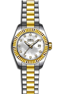 INVICTA Specialty Lady 38mm Stainless Steel Steel White dial PC32 Quartz , Band Material: Stainless Steel, Band Tone: Steel,Gold, Band Size [mm]: 18, Band Length [mm]: 174, Buckle Type: Fold over safety , Crown Type : Push, Case Material : Stainless Steel, Case Tone : Steel, Case Size (mm) : 38, Case Back : Solid, Material of Hands : Metal, Color of Hands : Gold, Crystal Type : Flame Fusion, Bezel Material : Stainless Steel, Dial Material : Oyster, Dial Color : White, Dial Pattern : None .Purchasing these parts and having a non-authorized repair center open your watch voids all manufacturing warranties. Invicta cannot guarantee the quality standards of an altered timepiece, the standard 3-year limited warranty on Invicta timepieces shall be invalid if the timepiece is serviced at any time by an unauthorized repair center. This includes battery replacements, which must be done at an Invicta authorized repair center in order to maintain the eligibility of the warranty. Please follow the link below to learn more about Invicta's warranty.https://cdn.invictawatch.com/www/files/invicta-warranty-2018.pdf
