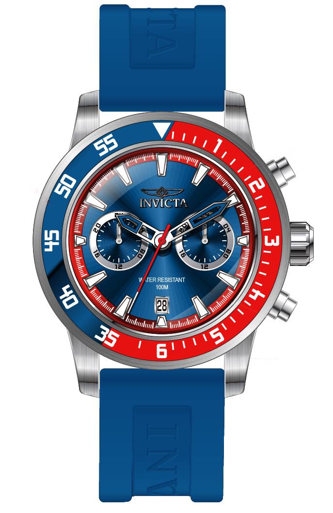 Band Material: Silicone, Band Tone: Blue, Band Width: 22MM, Band Length: 190MM, Crown Type: Push, Case Material: Stainless Steel, Case Tone: Steel, Case Size [mm]: 45, Case Back: Solid, Material of Hands: Metal, Color of Hands: Silver,Blue,Red, Crystal Type: Flame Fusion, Bezel Material: Stainless Steel, Dial Material: Metal, Dial Color: Blue, Dial Pattern: Sun-ray Finish .Purchasing these parts and having a non-authorized repair center open your watch voids all manufacturing warranties. Invicta cannot guarantee the quality standards of an altered timepiece, the standard 3-year limited warranty on Invicta timepieces shall be invalid if the timepiece is serviced at any time by an unauthorized repair center. This includes battery replacements, which must be done at an Invicta authorized repair center in order to maintain the eligibility of the warranty. Please follow the link below to learn more about Invicta's warranty.https://cdn.invictawatch.com/www/files/invicta-warranty-2018.pdf