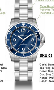 Band Material: Stainless Steel, Band Tone: Steel, Band Width: 20MM, Band Length: 205MM, Crown Type: Push, Case Material: Stainless Steel, Case Tone: Steel, Case Size [mm]: 40, Crystal Type: Mineral, Bezel Material: Stainless Steel, Dial Material: Brass, Dial Color: Blue, Dial Pattern: Glossy Finish .Purchasing these parts and having a non-authorized repair center open your watch voids all manufacturing warranties. Invicta cannot guarantee the quality standards of an altered timepiece, the standard 3-year limited warranty on Invicta timepieces shall be invalid if the timepiece is serviced at any time by an unauthorized repair center. This includes battery replacements, which must be done at an Invicta authorized repair center in order to maintain the eligibility of the warranty. Please follow the link below to learn more about Invicta's warranty.https://cdn.invictawatch.com/www/files/invicta-warranty-2018.pdf