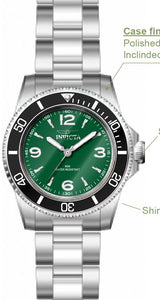 Band Material: Stainless Steel, Band Tone: Steel, Band Width: 20MM, Band Length: 205MM, Crown Type: Push, Case Material: Stainless Steel, Case Tone: Steel, Case Size [mm]: 40, Crystal Type: Mineral, Bezel Material: Stainless Steel, Dial Material: Brass, Dial Color: Green, Dial Pattern: Glossy Finish .Purchasing these parts and having a non-authorized repair center open your watch voids all manufacturing warranties. Invicta cannot guarantee the quality standards of an altered timepiece, the standard 3-year limited warranty on Invicta timepieces shall be invalid if the timepiece is serviced at any time by an unauthorized repair center. This includes battery replacements, which must be done at an Invicta authorized repair center in order to maintain the eligibility of the warranty. Please follow the link below to learn more about Invicta's warranty.https://cdn.invictawatch.com/www/files/invicta-warranty-2018.pdf