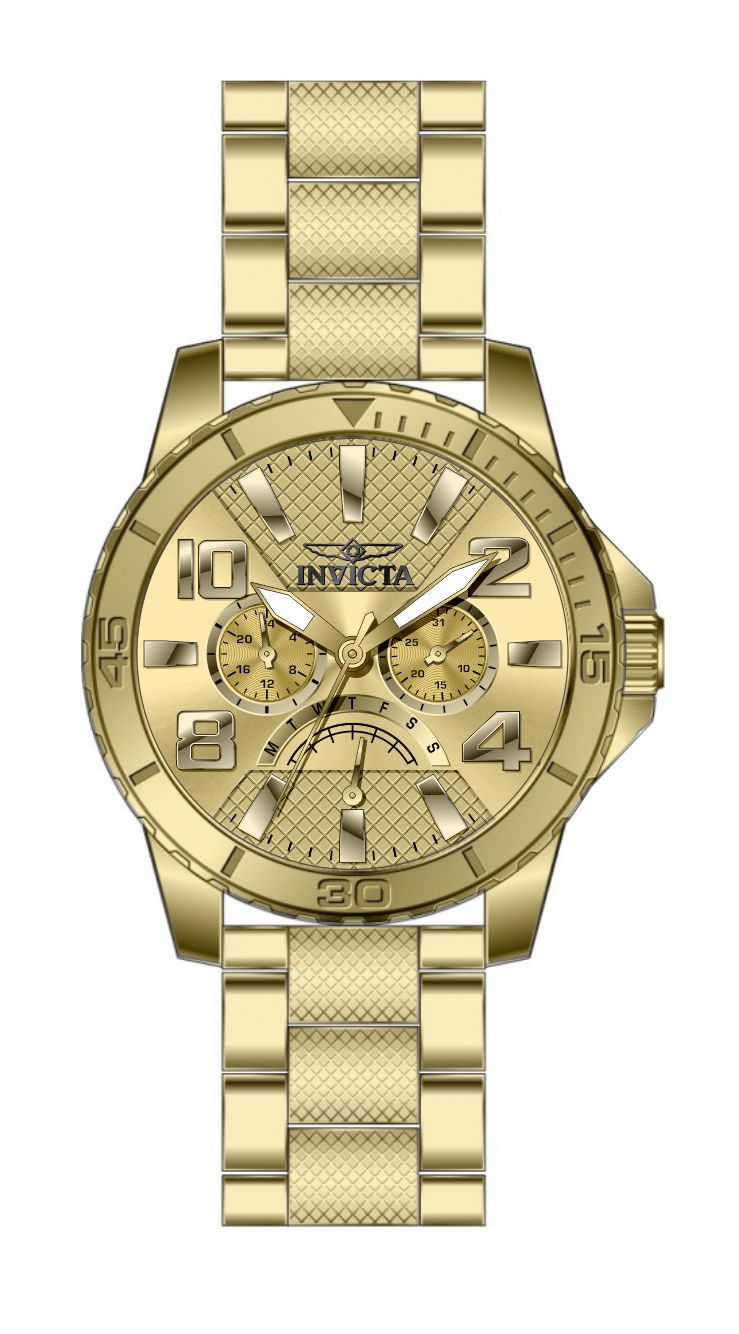 Band Material: Stainless Steel, Band Tone: Gold, Band Width: 22MM, Band Length: 182MM, Crown Type: Push, Case Material: Stainless Steel, Case Tone: Gold, Case Size [mm]: 48, Crystal Type: Flame Fusion, Dial Material: Brass, Dial Color: Gold .Purchasing these parts and having a non-authorized repair center open your watch voids all manufacturing warranties. Invicta cannot guarantee the quality standards of an altered timepiece, the standard 3-year limited warranty on Invicta timepieces shall be invalid if the timepiece is serviced at any time by an unauthorized repair center. This includes battery replacements, which must be done at an Invicta authorized repair center in order to maintain the eligibility of the warranty. Please follow the link below to learn more about Invicta's warranty.https://cdn.invictawatch.com/www/files/invicta-warranty-2018.pdf