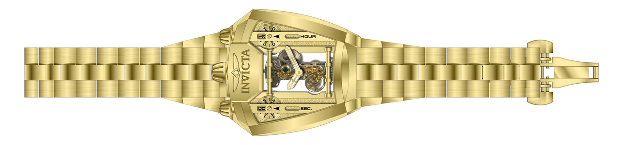 Band Material: Stainless Steel, Band Tone: Gold, Band Width: 33MM, Band Length: 225MM, Crown Type: Push, Case Material: Stainless Steel, Case Tone: Gold, Case Size [mm]: 58, Case Back: Exhibition, Material of Hands: Metal, Color of Hands: Gold,Luminous, Crystal Type: Flame Fusion, Bezel Material: Stainless Steel, Dial Material: Metal, Dial Color: Gold, Dial Pattern: Skeleton Design .Purchasing these parts and having a non-authorized repair center open your watch voids all manufacturing warranties. Invicta cannot guarantee the quality standards of an altered timepiece, the standard 3-year limited warranty on Invicta timepieces shall be invalid if the timepiece is serviced at any time by an unauthorized repair center. This includes battery replacements, which must be done at an Invicta authorized repair center in order to maintain the eligibility of the warranty. Please follow the link below to learn more about Invicta's warranty.https://cdn.invictawatch.com/www/files/invicta-warranty-2018.pdf